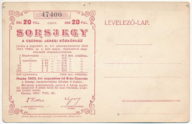 Csorna 1903. "A Csornai Járási Közkórház" sorsjegye 20f érté... https://www.darabanth.com/de/444-Fernauktion/444.0/Numismatik/Aktien-und-Tickets~1000005/Csorna-1903-A-Csornai-Jarasi-Kozkorhaz-sorsjegye-20f-ertekben-hatoldalan-megcimzett-le~II2931079