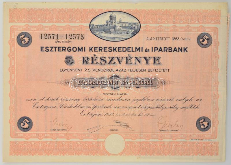Esztergom 1932. "Esztergomi Kereskedelmi és Iparbank" öt részvénye egyben, 125P-ről, szárazpecséttel és szelvényekkel T:VF / Hungary / Esztergom 1932. "Commerocial and Industrial Bank of Esztergom" 5 shares in one, all about 125 Pengő, with embossed stamp and coupons C:XF
