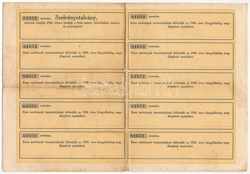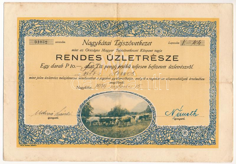 Nagykáta 1939. "Nagykátai Tejszövetkezet" rendes üzletrésze ... https://www.darabanth.com/de/444-Fernauktion/444.0/Numismatik/Aktien-und-Tickets~1000005/Nagykata-1939-Nagykatai-Tejszovetkezet-rendes-uzletresze-10P-ertekben-01032-sorszammal~II2927901