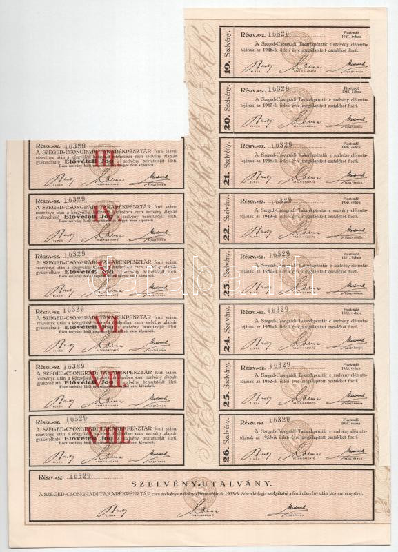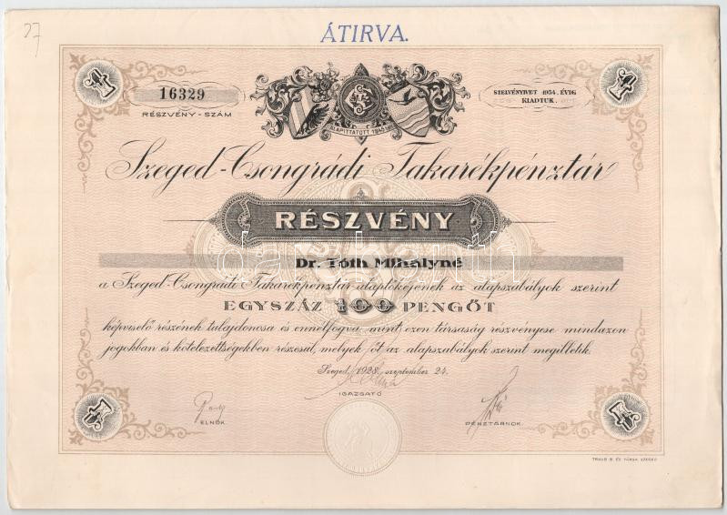 Szeged 1928. "Szegedi-Csongrádi Takarékpénztár" névre szóló részvénye 100P-ről, szárazpecséttel, szelvényekkel, bélyegzéssel T:VF hajtásnál nagyobb szakadás / Hungary / Szeged 1928. "Szeged-Csongrád Savings Bank" share about 100 Pengő, with embossed stamp and coupons, with overprint C:VF bigger tear at the fold