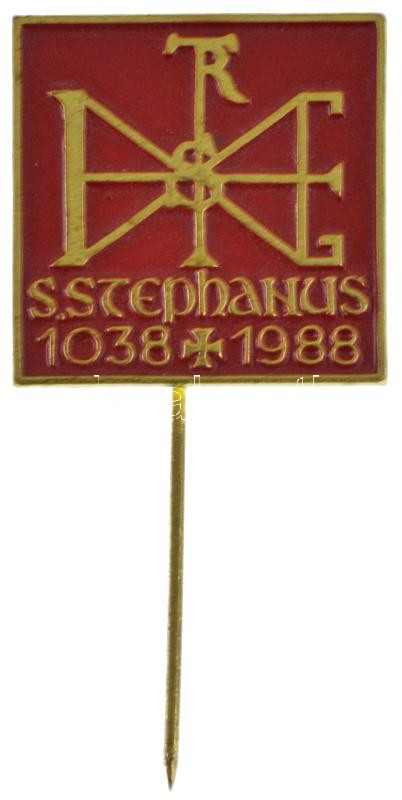 1988. "S. STEPHANUS 1038-1988" aranyozott, festett fém jelvé... https://www.darabanth.com/de/444-Fernauktion/444.0/Numismatik/Faleristik-Auszeichnungen-Medaillen-Orden~1000018/1988-S-STEPHANUS-1038-1988-aranyozott-festett-fem-jelveny-20x20mm-TAU~II2911575