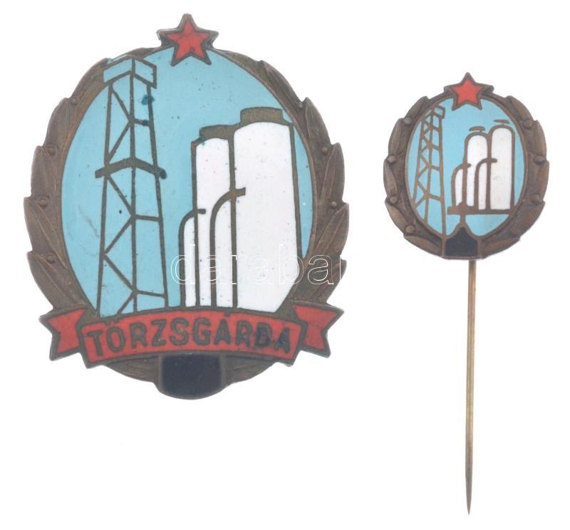 ~1950. "Vegyipari Törzsgárda" zománcozott fém jelvény, hátoldalán vésett számozással "3699" (40x34mm) + "Vegyipari Törzsgárda" zománcozott miniatűr T:AU