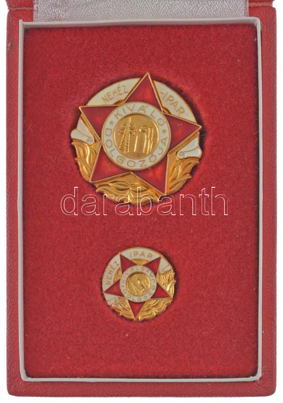 ~1960. "Nehézipar Kiváló Dolgozója" zománcozott, aranyozott fém jelvény miniatűrrel, dísztokban T:AU