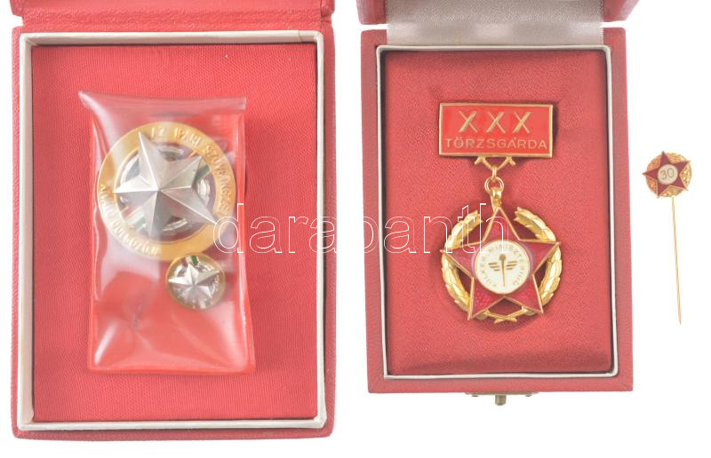 ~1970-1975. "XXX. Törzsgárda - Külker. Minisztérium" aranyozott, műgyantás kitüntető jelvény miniatűrrel, eredeti tokban (31mm) + "Az ipari szövetkezet kiváló dolgozója" festett, rátétes kitüntető jelvény miniatűrrel nem eredeti tokban (35mm) T:1