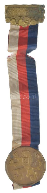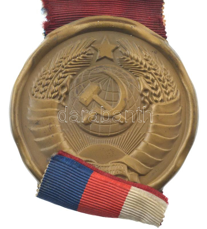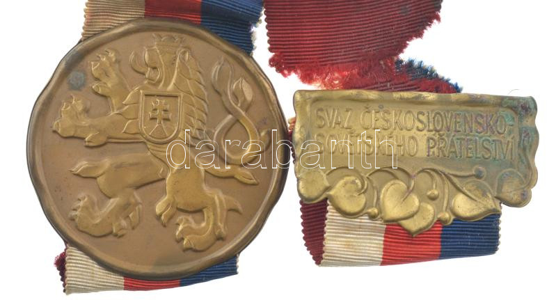 Csehszlovákia ~1950. "A Csehszlovák-Szovjet Barátság Szövetsége / A Szovjetunióval a világbékéért" bronz lemezérem sérült szalagon (60mm) T:VF Czechoslovakia ~1950. "Svaz Československo-Sovětskeho Přátelství / Se Sovětským svazem za světový mír (Union of Czechoslovak-Soviet Friendship / With the Soviet Union for world peace)" bronze plate medallion with damaged ribbon C:VF