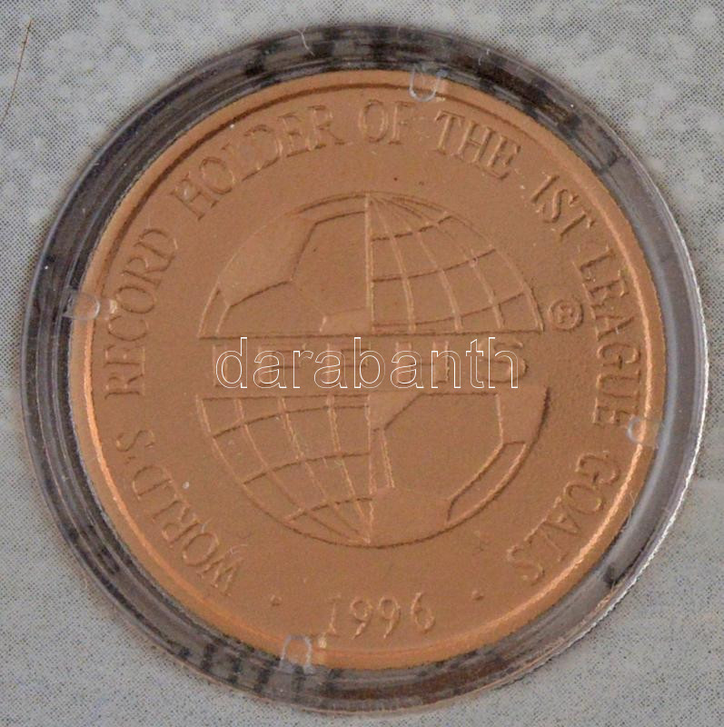 Bognár György (1944-) 1996. "Puskás Ferenc / World's record holder of the 1st league goals" kétoldalas, angol nyelvű, jelzett Au emlékérem "019" sorszámú tanúsítvánnyal, "Az évszázad gólkirálya" műbőr mappában (15g/0.585/30mm) T:PP ujjlenyomat Hungary 1996. "Ferenc Puskás / World's record holder of the 1st league goals" two-sided hallmarked Au commemorative medallion with a "019" serial number certificate, in "Az évszázad gólkirálya (Top scorer of the century)" faux leather folder. Sign.: György Bognár (15g/0.585/30mm) C:PP fingerprints