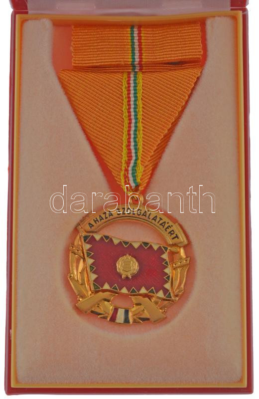 1964. "A Haza Szolgálatáért Érdemérem arany fokozat" zománcozott aranyozott bronz kitüntetés mellszalagon, szalagsávval, eredeti tokban T:UNC kissé sérült tok