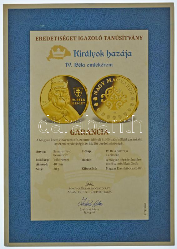 ifj. Szlávics László (1959-) 2011. "Nagy Magyarok / IV. Béla" aranyozott Cu emlékérem tanúsítvánnyal (40mm) T:PP