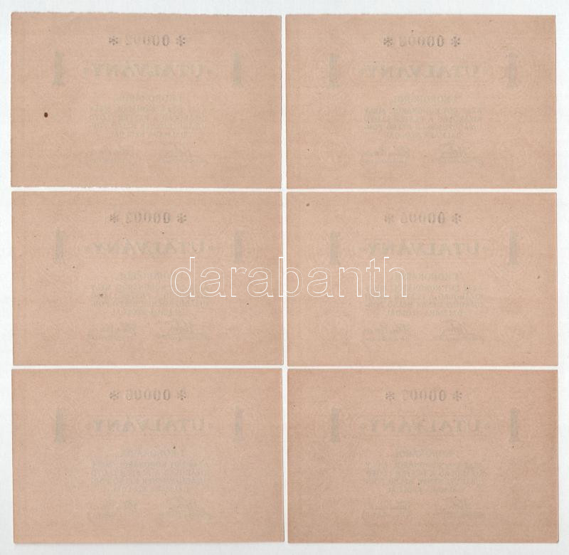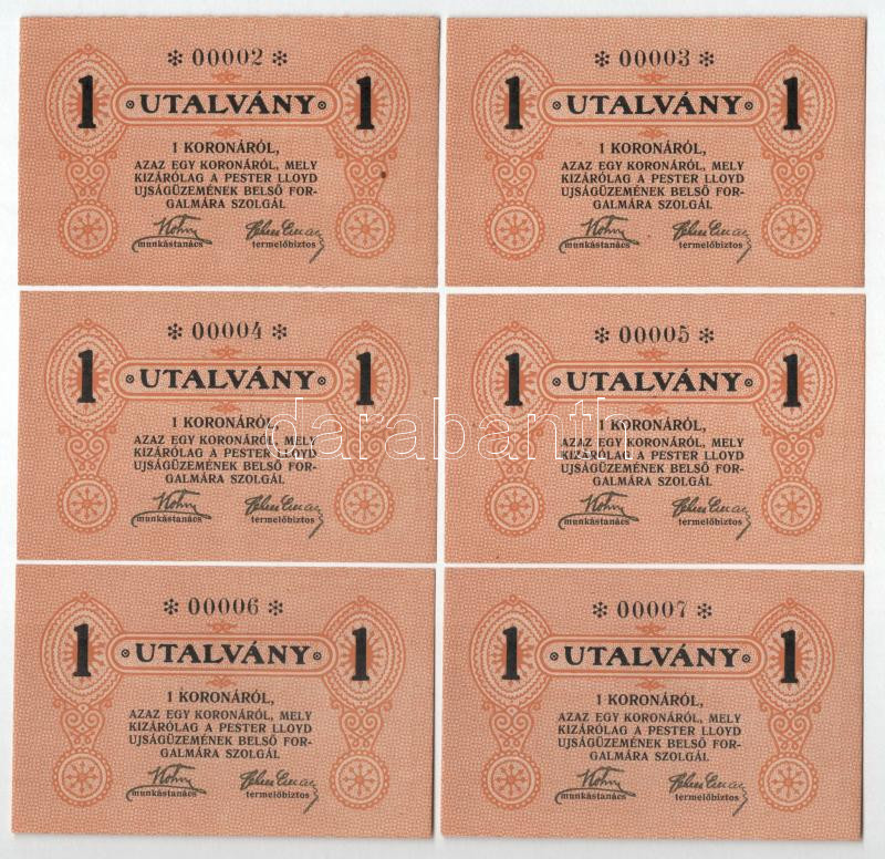 Budapest ~1920. 1K "Pester Lloyd" utalvány (6x) sorszámkövetők "00002-00007", hátoldalon bélyegző nélkül T:UNC,AU / Hungary / Budapest ~1920. 1 Korona "Pester Lloyd" voucher (6x) with consecutive serials "00002-00007", on the back without cancellation C:UNC,AU Adamo BUC-212.1.1