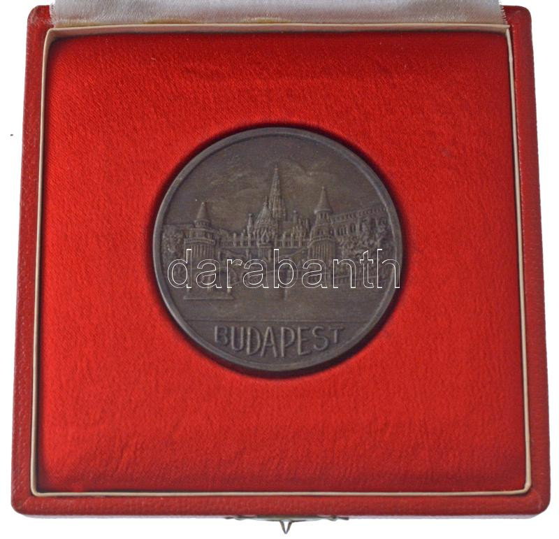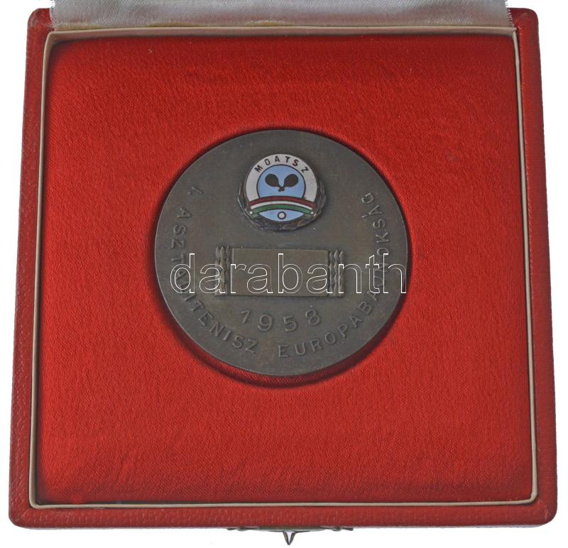 1958. "Asztalitenisz Európa Bajnokság / Budapest" kétoldalas fém díjérem, előlapján a "MOATSZ (Magyar Országos Asztalitenisz Szövetség)" zománcozott címerével, hátoldalán a Berán Lajos-féle "Budapesti Emlék" érmén látható Halászbástya ábrázolással, eredeti tokban (54mm) T:XF