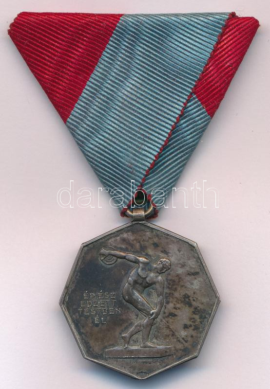 ~1900. "Ép ész edzett testben él" jelzett Ag sport emlékérem, mellszalagon (13,00g/0.800/33mm) T:AU patina Hungary ~1900. "Ép ész edzett testben él" hallmarked Ag sports commemorative medallion (13,28g/0.800/33mm) C:AU patina