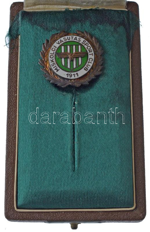 ~1960. "Miskolci Vasutas Sport Club (MVSC)" zománcozott fém jelvény eredeti dísztokban. A zöld-fehér színeket viselő Miskolci Vasutas SC-t 1911-ben alapították. A csapat a kezdetektől egészen 1937-ig folyamatosan II. osztályú volt. A kiesésig három bajnoki címet, három ezüstérmet és hat bronzérmet szerzett. Az 1937-es kiesést követően két szezon után visszajutott az addigra NB II-nek nevezett másodosztályba, s tagságát meg is tartotta egészen 1946-ig, majd egy III. osztályú idény után visszajutottak. 1948-ban a klubot Miskolci Lokomotívnak, majd 1955-ben egy idény erejéig Miskolci Törekvésnek hívták. 1956-tól ismét MVSC, ez idő alatt végig az NB II-ben játszott a csapat. 1958-ban aztán az MVSC történelme során először összejött az, ami a városi rivális Diósgyőrnek már régóta: az NB II-t megnyerve feljutottak az NB I-be. Innen egyből kiestek, s nem is tértek már vissza soha. Lassú süllyedés következett a klub életében, 1969-ig II. osztályúak voltak, majd következett öt idény a III. osztályban a visszajutásig. Ekkor már csak négy szezont töltöttek a másodvonalban, mikor is zsinórban két kiesést követően 1983-ban a megye I-ben (IV. osztály) találták magukat. Innen még azonnal sikerült visszajutni, azonban ismét kiestek, s következett hatszezonnyi megye I-es szereplés. 1991-ben sikerült a visszajutás az NB III-ba, sőt, 1994-ben még az NB II is összejött, azonban újra megindultak lefelé: az ezredfordulóra újra a megye I-ben találták magukat, ami akkor már csak az V. osztályt jelentette. 2005-ben jártak utoljára az NB III-ban (IV. osztály), azóta szinte minden idényben a megye I-et erősítették, de két szezont eltöltöttek a megye II-ben is. T:1,1-