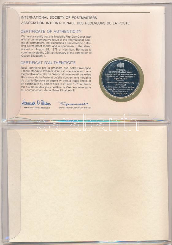 1978. "Postamesterek Nemzetközi Szövetsége hivatalos emlékérem kiadása 1978 - Bermuda" Ag emlékérem érmés borítékban, első napi bélyegzős bélyeggel, holland nyelvű leírással (20g/0.925/39mm) T:PP 1978. "Internatinal Society of Postmasters Official Commemorative Issue 1978 - Bermuda" Ag commemorative medallion in coin envelope, with stamp and first day cancellation, with Dutch information (20g/0.925/39mm) C:PP