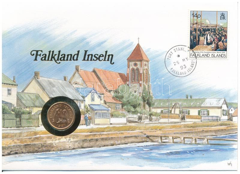 Falkland-szigetek 1987. 1p Bronz "II. Erzsébet" emlékérme felbélyegzett borítékban, bélyegzéssel, német nyelvű tájékoztatóval T:UNC patina Falkland Islands 1987. 1 Penny Bronze "Elisabeth II" commemorative coin in envelope with stamp, cancellation and a prospectus in german C:UNC patina