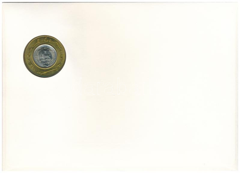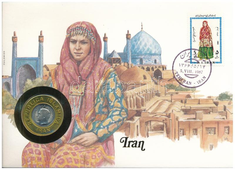 Irán 1972. 1R Cu-Ni "Mohammad Reza" réz "Republica Islamica Iran" gyűrűbe foglalva felbélyegzett borítékban, bélyegzéssel, német nyelvű tájékoztatóval T:AU Iran 1972. 1 Rial Cu-Ni "Mohammad Reza" in a "Republica Islamica Iran" brass ring in envelope with stamp, cancellation and a prospectus in german C:AU