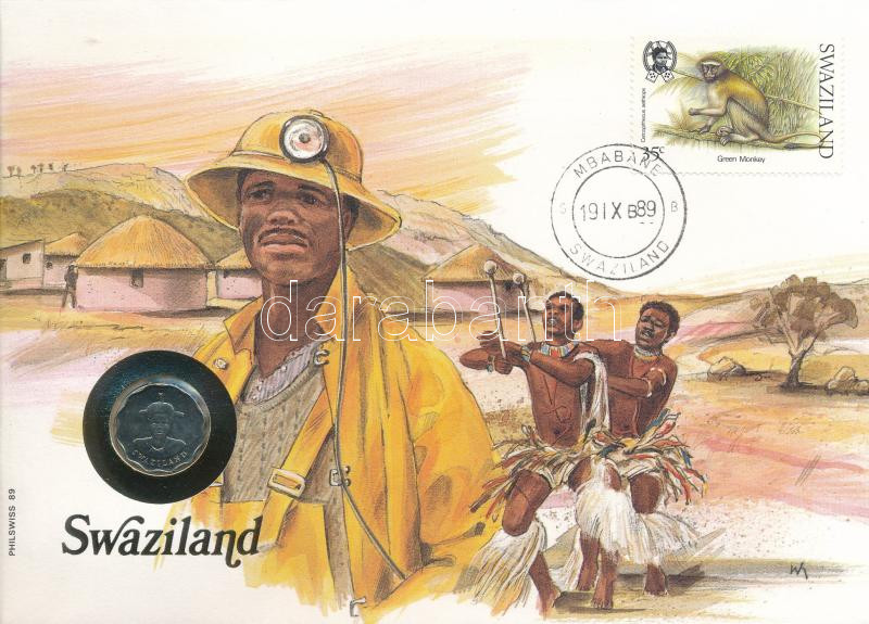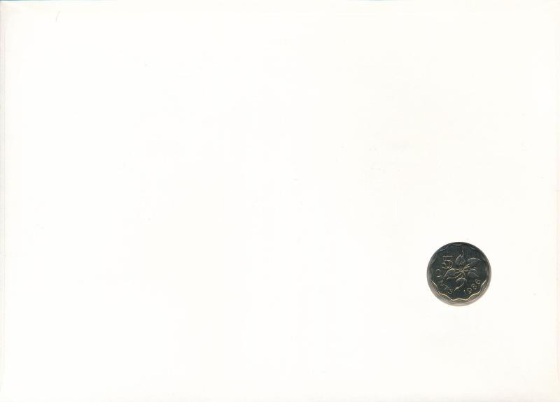 Swaziland 1986. 5 Cents Cu-Ni in envelope with stamp, cancellation, and a description in german C:UNC
