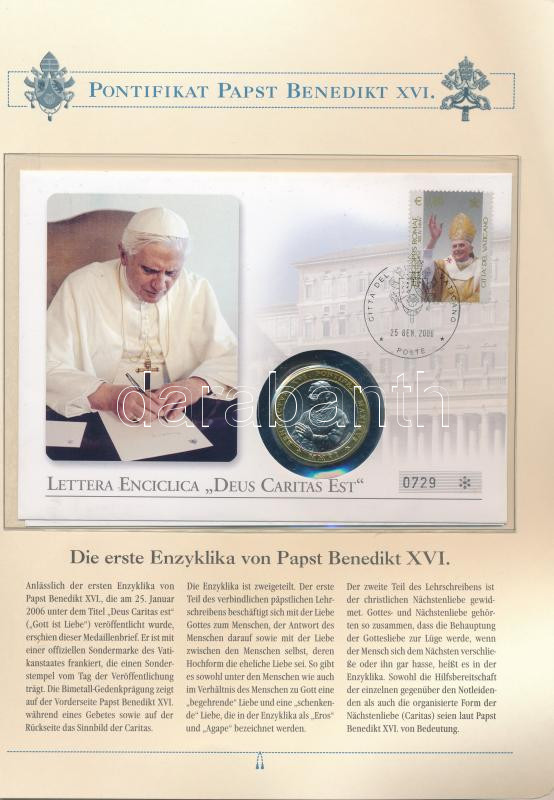 Vatikán 2006. "XVI. Benedek első Enciklikája" emlékérem sorszámozott, felbélyegzett borítékban, elsőnapi bélyegzéssel, nagyalakú német nyelvű tájékoztatóval T:UNC Vatican 2006. "The first encyclical of Pope Benedict XVI" commemorative medallion in serial numbered envelope with stamp, first day cancellation and with a large information sheet in German C:UNC