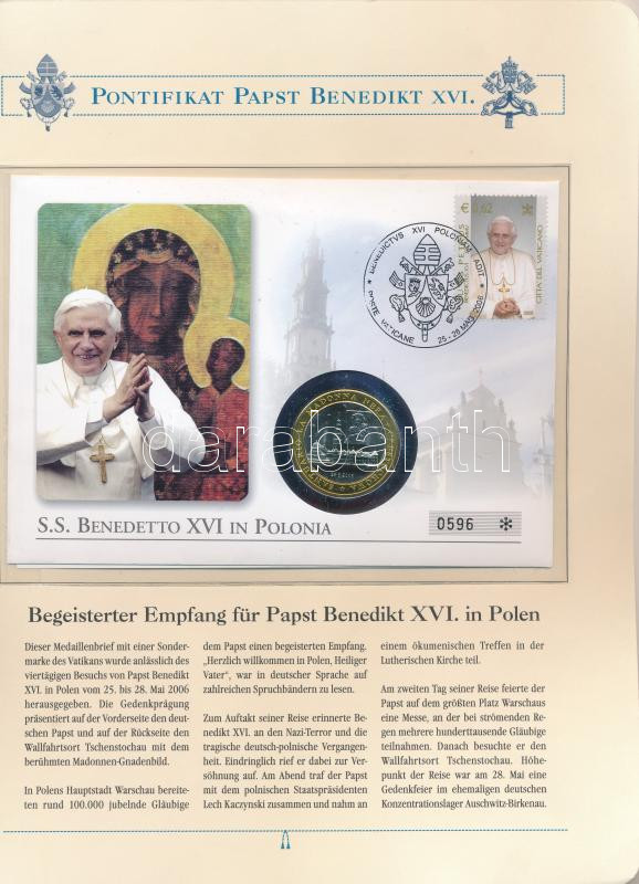 Vatikán 2006. "XVI. Benedek pápa látogatása Lengyelországba" emlékérem sorszámozott, felbélyegzett borítékban, elsőnapi bélyegzéssel, nagyalakú német nyelvű tájékoztatóval T:UNC Vatican 2006. "Pope Benedict XVI 's visit to Poland" commemorative medallion in serial numbered envelope with stamp, first day cancellation and with a large information sheet in German C:UNC