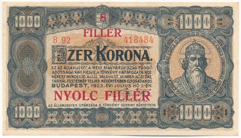 1923. 1000K "8 FILLÉR - NYOLC FILLÉR" felülbélyegzéssel, nyo... https://www.darabanth.com/de/444-Fernauktion/444.0/Numismatik/Ungarische-Banknoten~1000007/1923-1000K-8-FILLER-NYOLC-FILLER-felulbelyegzessel-nyomdahely-jeloles-nelkul-TAU-Ad~II2922119