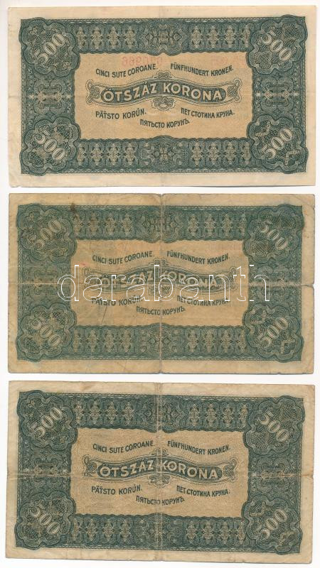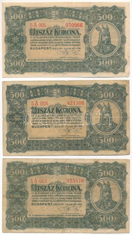 Beschreibung: 1923. 500K (3x) "Magyar Pénzjegynyomda Rt. Budapest" nyomdahely jelöléssel T:F,VG