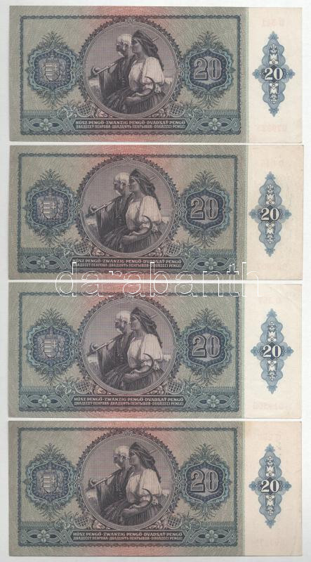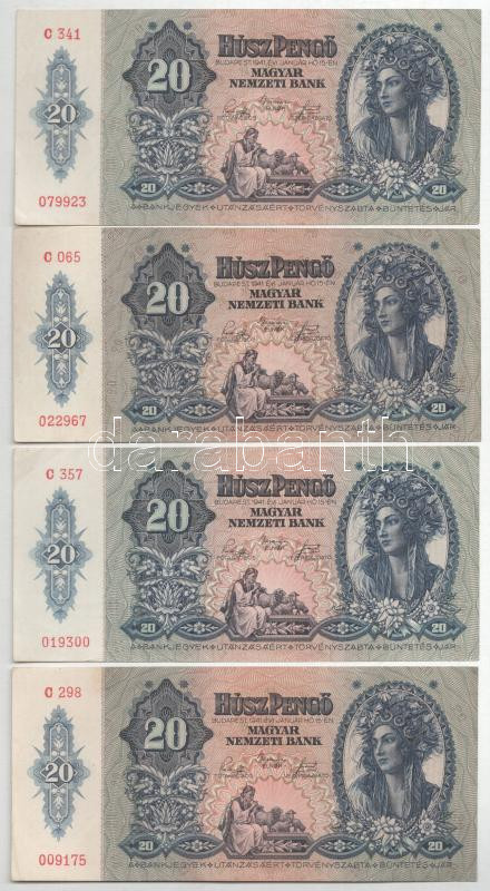 1941. 20P (4db) T:F közte szép papír https://www.darabanth.com/de/444-Fernauktion/444.0/Numismatik/Ungarische-Banknoten~1000007/1941-20P-4db-TF-kozte-szep-papir~II2933411