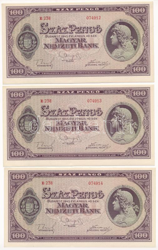 1945. 100P (3x) sorszámkövetők "B 238 074912 - B 238 074914"... https://www.darabanth.com/de/444-Fernauktion/444.0/Numismatik/Ungarische-Banknoten~1000007/1945-100P-3x-sorszamkovetok-B-238-074912-B-238-074914-TAU-Hungary-1945-100-Pengo-3x~II2876194