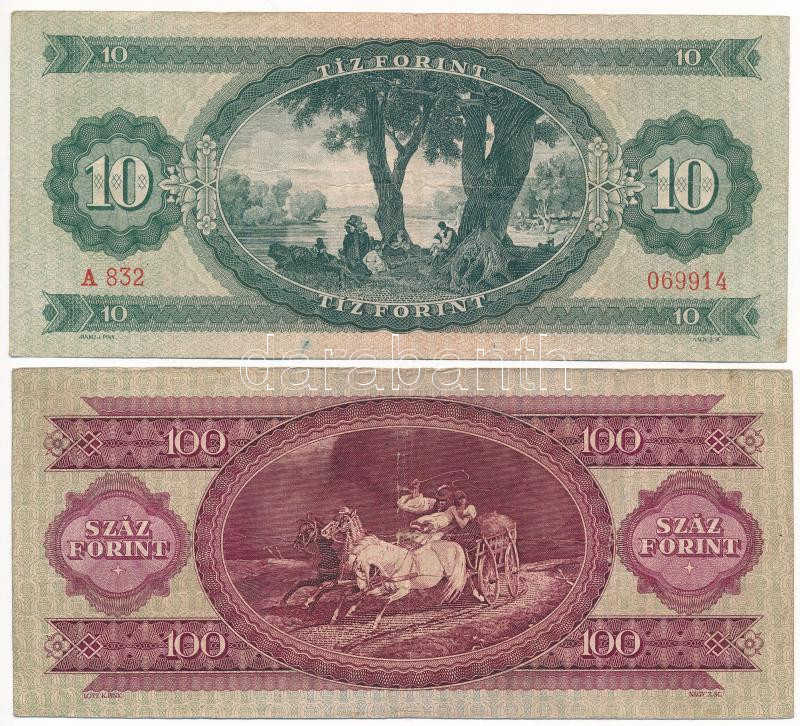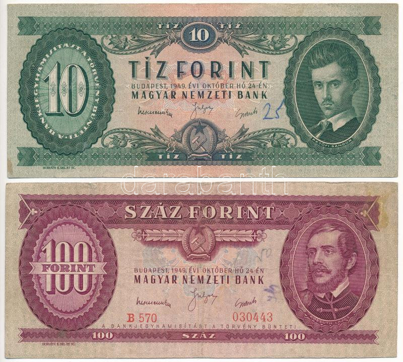 1949. 10Ft + 100Ft T:F Adamo F3, F28 https://www.darabanth.com/de/444-Fernauktion/444.0/Numismatik/Ungarische-Banknoten~1000007/1949-10Ft-plus-100Ft-TF-Adamo-F3-F28~II2932573