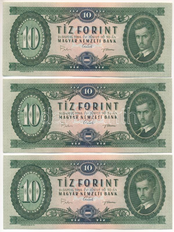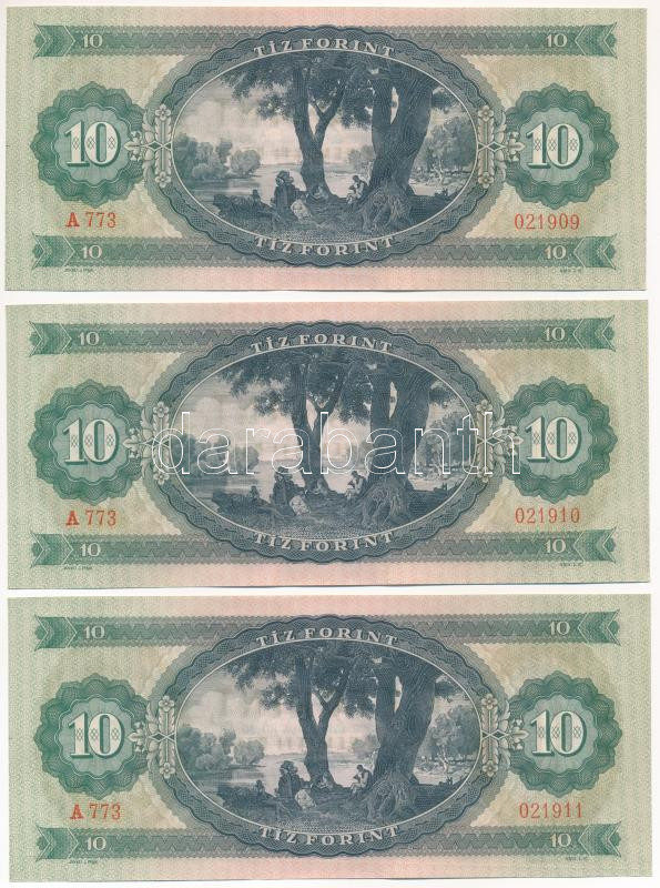 1969. 10Ft (3x) sorszámkövetők "A 773 021909 - A 773 021911"... https://www.darabanth.com/de/444-Fernauktion/444.0/Numismatik/Ungarische-Banknoten~1000007/1969-10Ft-3x-sorszamkovetok-A-773-021909-A-773-021911-TAU-Adamo-F7~II2930148