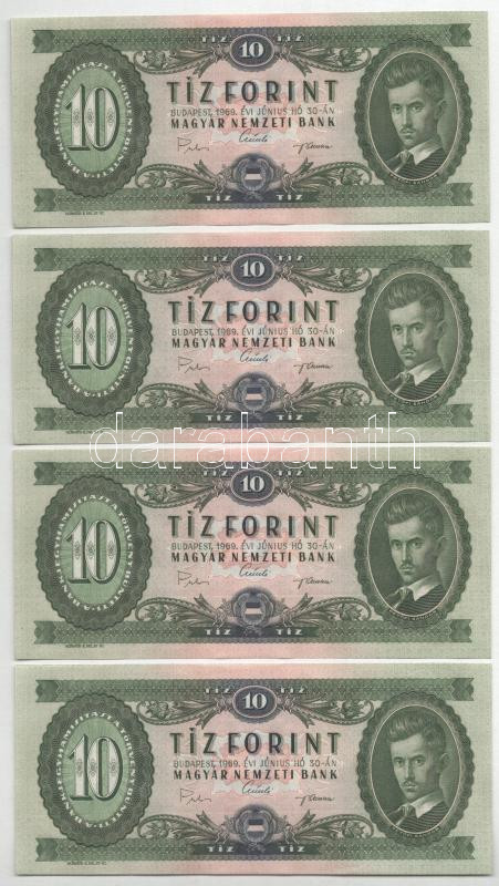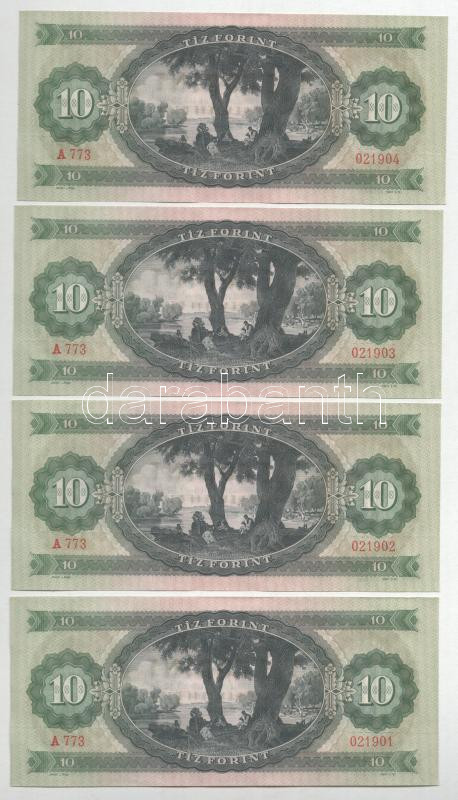 1969. 10Ft (4x) sorszámkövetők "A 773 021901 - A 773 021904"... https://www.darabanth.com/de/444-Fernauktion/444.0/Numismatik/Ungarische-Banknoten~1000007/1969-10Ft-4x-sorszamkovetok-A-773-021901-A-773-021904-TAU-XF-Adamo-F7~II2930021