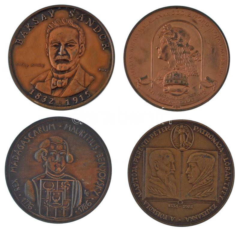 Beschreibung: 4db klf bronz emlékérem, közte Ligeti Erika (1934-2004) 1986. "REX MADAGASCARUM MAURITIUS BENYOVSKY 1776-1786 / MÉE 1986" Benyovszky Móric Br emlékérem (42,5mm), Bognár György (1944-) 1989. "Baksay Sándor 1832-1915 / Kunszentmiklósi Baksay Sándor Gimnázium" kétoldalas bronz emlékérem (42,5mm) T:UNC,AU