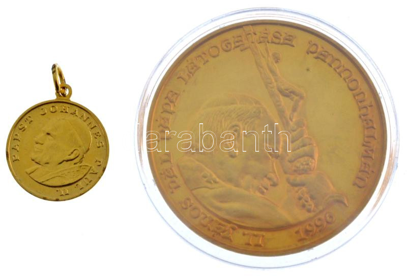 Bognár György (1944-) 1996. "II. János Pál pápa látogatása Pannonhalmán" aranyozott fém emlékérem (42,5mm) + DN "II. János Pál" német nyelvű aranyozott fém medál (18mm) T:PP,1-