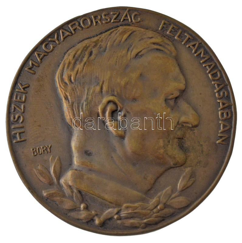 Bory Jenő (1879-1959) DN "Hiszek Magyarország feltámadásában - (Horthy Miklós)" ezüstözött bronz lemezplakett (54mm) T:XF patina, a hátoldaláról letört a tű