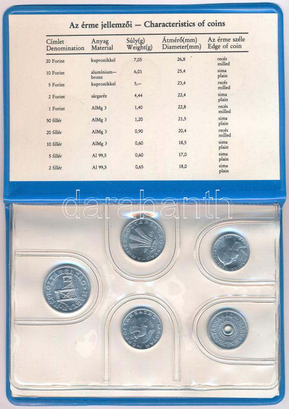 Beschreibung: 1986. 2f-10Ft (9klf) forgalmi sor, "Magyar Népköztársaság - forgalmi érméi" feliratú királykék műbőrtokban T:UNC