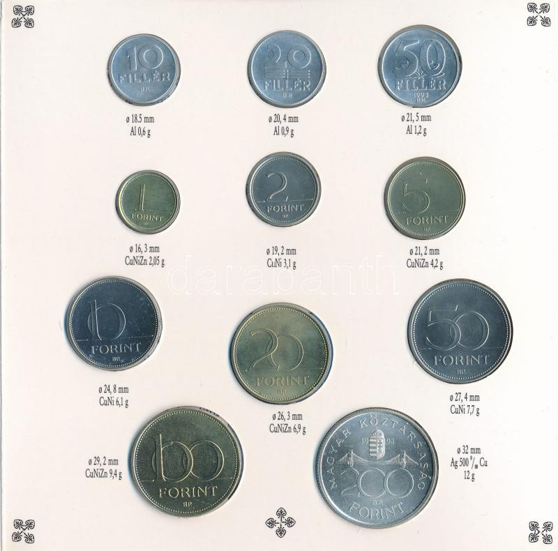 1993. 10f-200Ft (11xklf) forgalmi sor, benne 200Ft Ag "MNB",... https://www.darabanth.com/de/444-Fernauktion/444.0/Numismatik/Ungarische-Kursmunzsatze~1000021/1993-10f-200Ft-11xklf-forgalmi-sor-benne-200Ft-Ag-MNB-Magyarorszag-penzermei-karton-di~II2852838