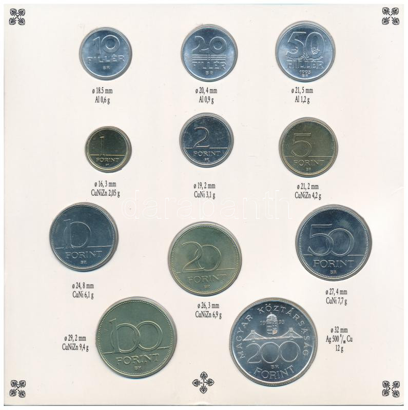 1993. 10f-200Ft (11xklf) forgalmi sor, benne 200Ft Ag "MNB", "Magyarország pénzérméi" karton dísztokban, egylapos verzió, belső tok ragasztása kissé elengedett T:BU Adamo FO26