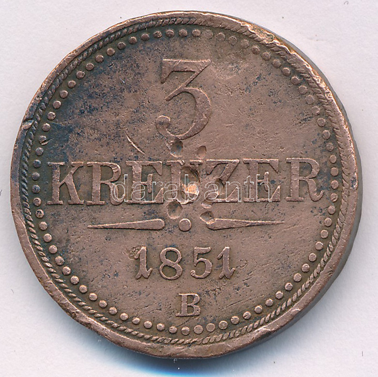 1851B 3kr Cu T:F ü., durva ph. Adamo M6 https://www.darabanth.com/de/444-Fernauktion/444.0/Numismatik/Ungarische-Munzen-und-Munzen-mit-ungarischem-Munzzeichen~1000008/1851B-3kr-Cu-TF-u-durva-ph-Adamo-M6~II2925476
