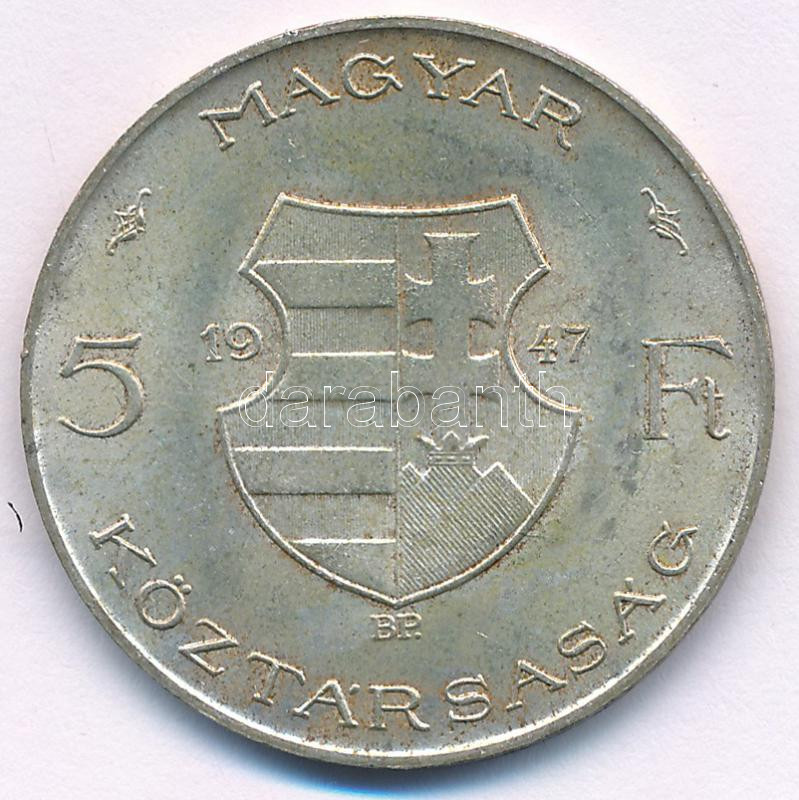 1947. 5Ft Ag "Kossuth" T:AU patina Adamo F8.1 https://www.darabanth.com/de/444-Fernauktion/444.0/Numismatik/Ungarische-Munzen-und-Munzen-mit-ungarischem-Munzzeichen~1000008/1947-5Ft-Ag-Kossuth-TAU-patina-Adamo-F81~II2926948