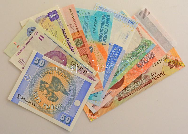 10db-os vegyes külföldi bankjegy tétel, közte Kambodzsa, Kirgizisztán, Horvátország, Mianmar, Nicaragua, Ukrajna, Madagaszkár, India, Zambia T:UNC,AU az egyiken tűzőgép ly. 10pcs of mixed foreign banknote lot, in it Cambodia, Kyrgyzstan, Croatia, Myanmar, Nicaragua, Ukraine, Madagascar, India, Zambia C:UNC,AU stapler holes on one
