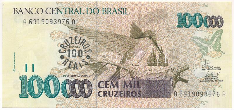 Beschreibung: Brazília 1993. 100.000C "100 CRUZEIROS REAIS" felülbélyegzéssel T:UNC