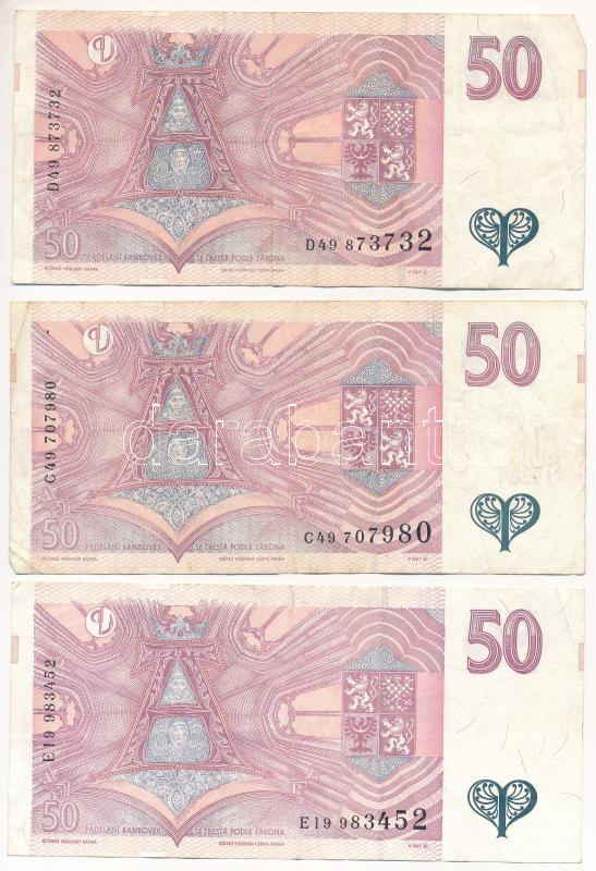 Czech Republic 1997. 50 Korun (3-x) C:F https://www.darabanth.com/de/444-Fernauktion/444.0/Numismatik/Weltweit-Banknoten~1000013/Csehorszag-1997-50K-3x-TF-Czech-Republic-1997-50-Korun-3-x-CF~II2931613