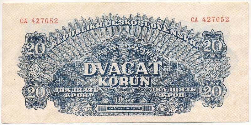 Czechoslovakia 1944. 20 Korun ... https://www.darabanth.com/de/444-Fernauktion/444.0/Numismatik/Weltweit-Banknoten~1000013/Csehszlovakia-1944-20K-TF-szep-papir-Czechoslovakia-1944-20-Korun-CF-fine-paper-Krause-P2347~II2926476