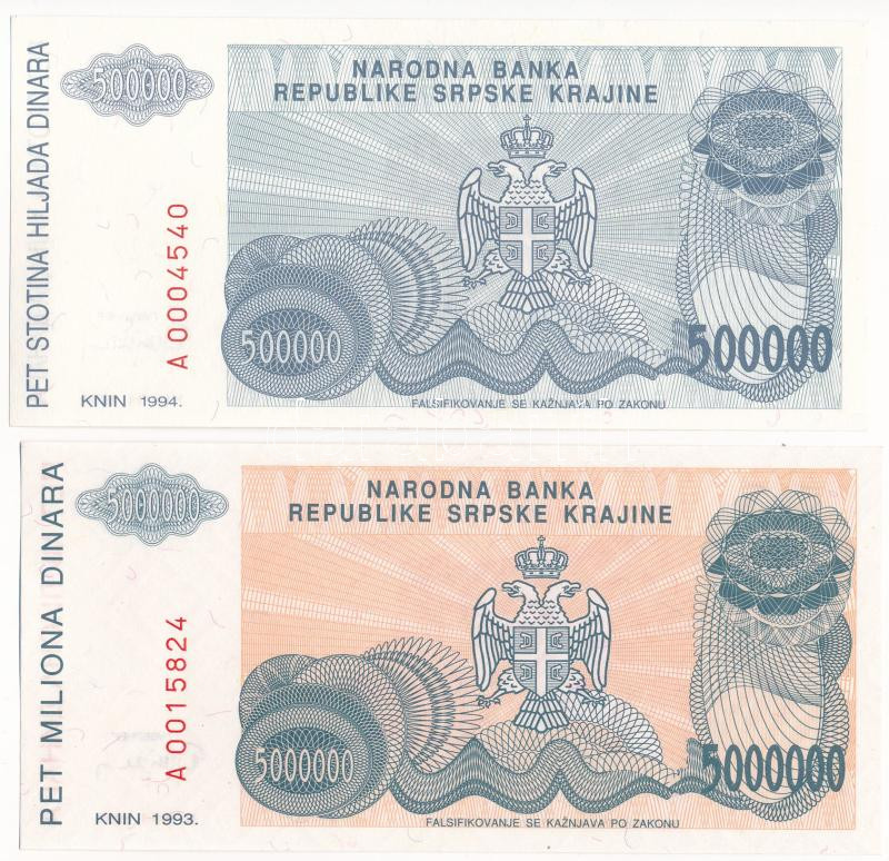 Horvátország / Krajnai Szerb Köztársaság 1993. 5.000.000D + 1994. 500.000D T:UNC,AU