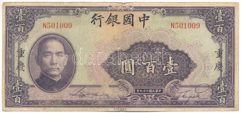 Kína 1940. 100Y T:F,VG China 1940. 100 Yuan C:F,VG Krause P#88 https://www.darabanth.com/de/444-Fernauktion/444.0/Numismatik/Weltweit-Banknoten~1000013/Kina-1940-100Y-TF-VG-China-1940-100-Yuan-CF-VG-Krause-P2388~II2933936