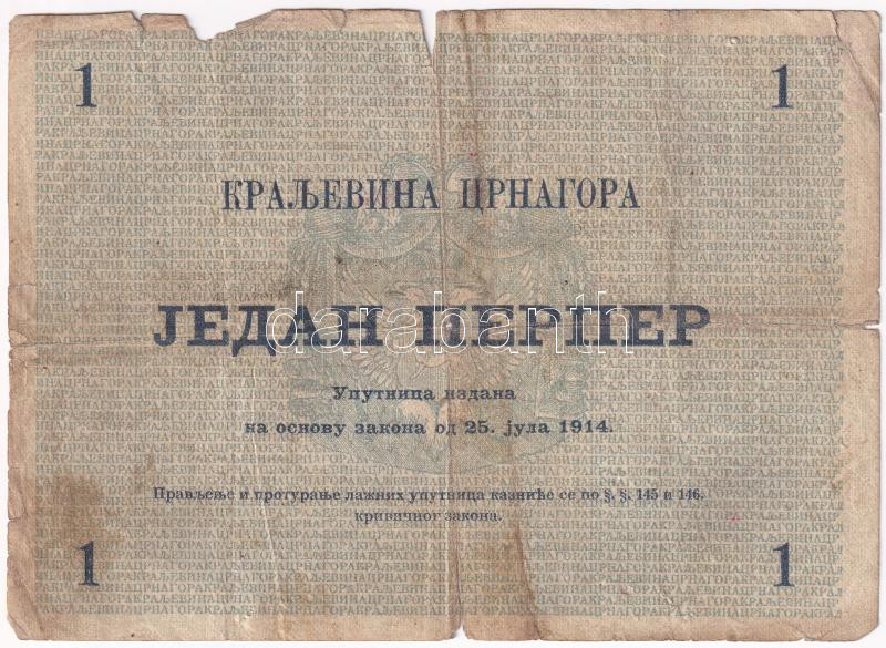 Montenegró 1914. 1P T:VG kis papírhiány Montenegro 1914. 1 Perpera C:V... https://www.darabanth.com/de/444-Fernauktion/444.0/Numismatik/Weltweit-Banknoten~1000013/Montenegro-1914-1P-TVG-kis-papirhiany-Montenegro-1914-1-Perpera-CVG-small-missing-paper-Kraus~II2856060