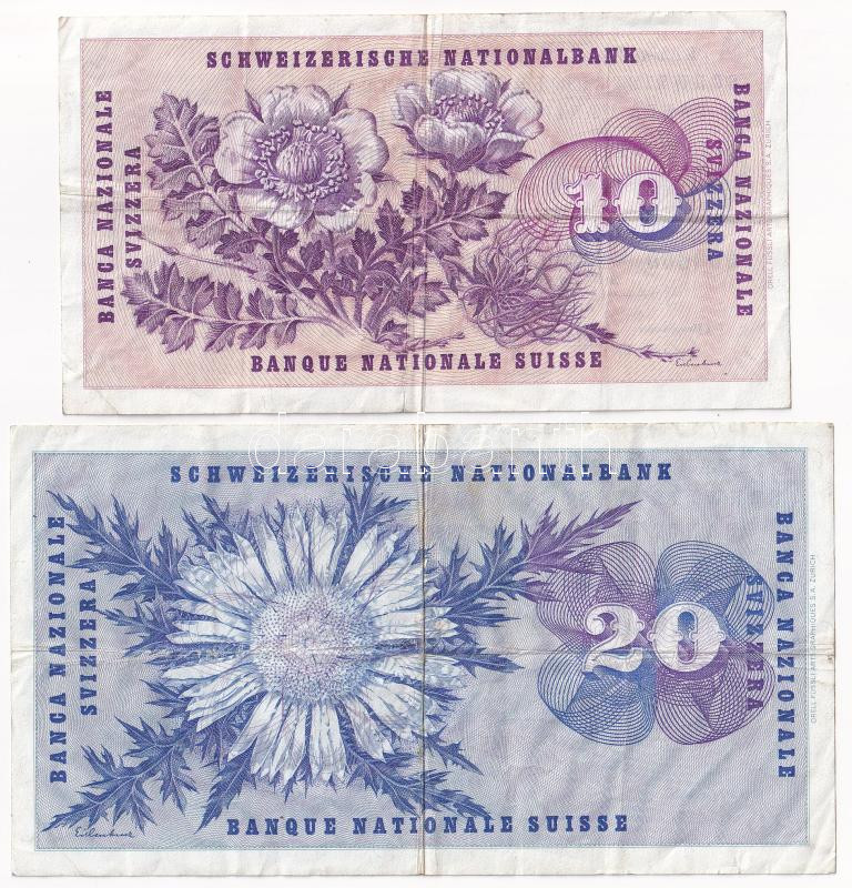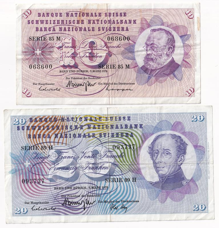 Beschreibung: Svájc 1973. 10Fr "85M 068600" + 20Fr "89H 093737" T:III folt