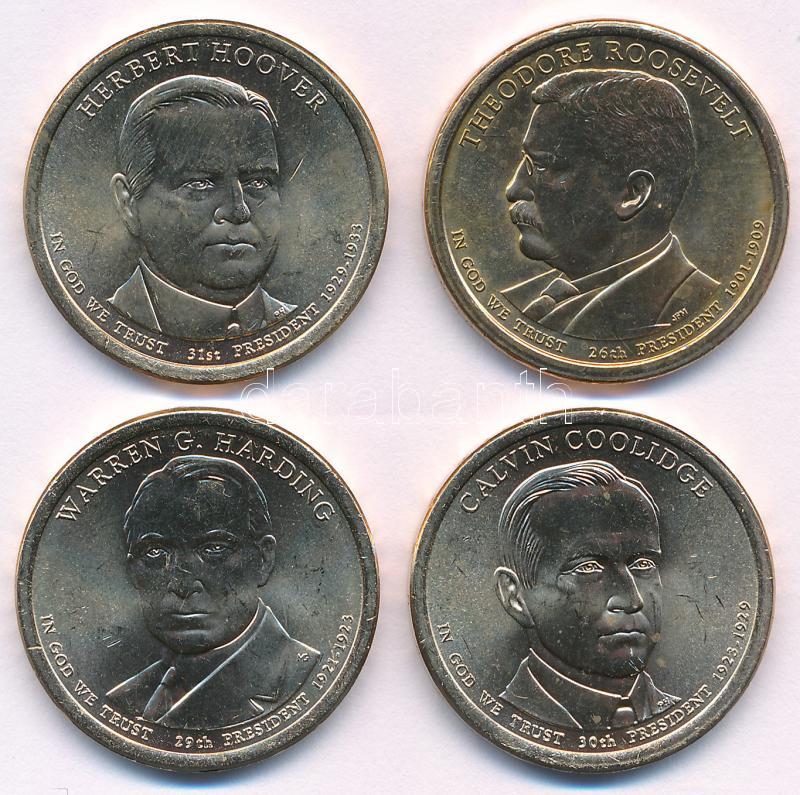 Amerikai Egyesült Államok 2014D-P 1$ Cu-Ni-Zn "Elnöki Dollárok - Warren G. Harding, Calvin Coolidge, Herbert Hoover, Theodore Roosevelt" (4xklf) kapszulában T:UNC USA 2014D-P 1 Dollar Cu-Ni-Zn "Warren G. Harding, Calvin Coolidge, Herbert Hoover, Theodore Roosevelt" (4xdiff) in capsules C:UNC