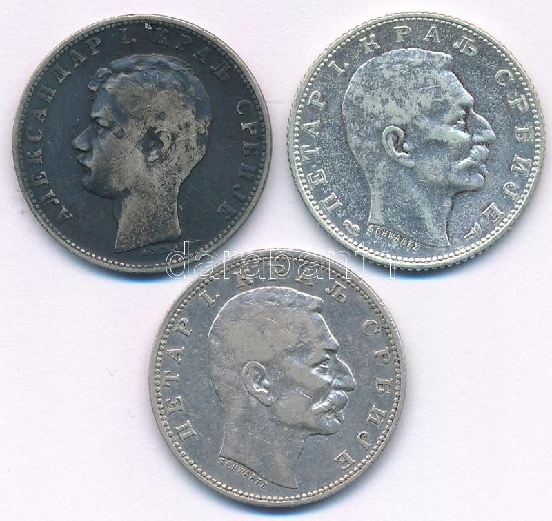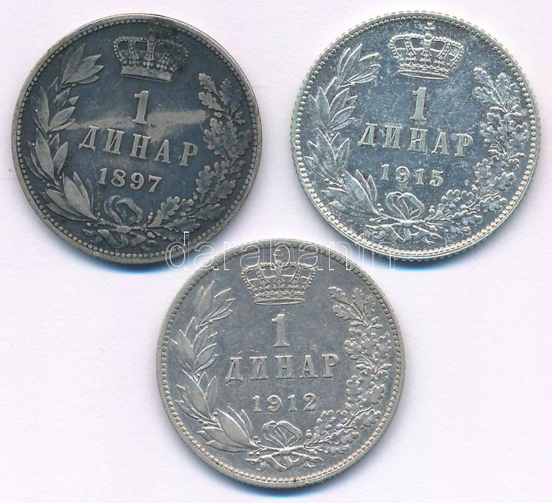 Szerbia 1897. 1D Ag "I. Sándor" + 1912. 1D Ag "I. Péter" + 1915. 1D Ag "I. Péter" T:F,XF Serbia 1897. 1 Dinar Ag "Aleksandar I" + 1912. 1 Dinar Ag "Petar I" + 1915. 1 Dinar Ag "Peter I" C:F,XF