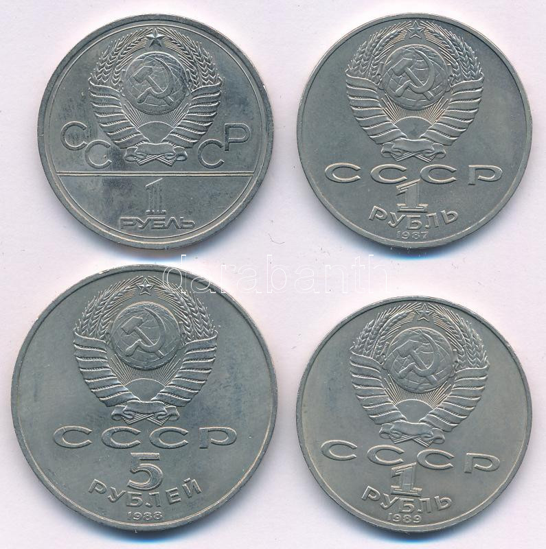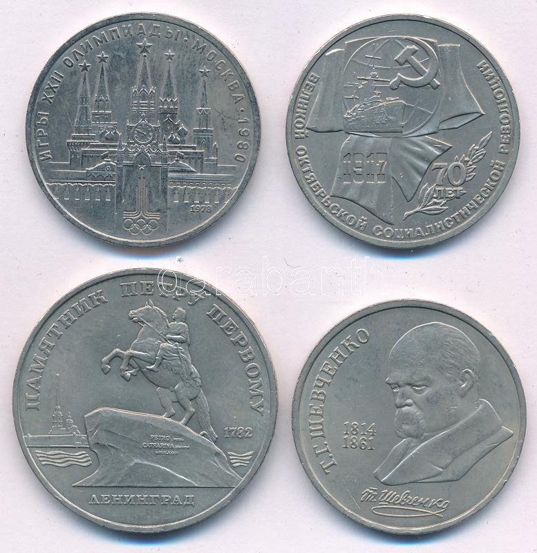 Szovjetunió 1978. 1R Cu-Ni "Kreml" (hibás óra változat, 4 helyett 6! (IV helyett VI)) + 1987. 1R Cu-Ni "Az októberi forradalom 70. évfordulója" + 1988. 5R Cu-Ni "Nagy Péter emlékmű" + 1989. 1R Cu-Ni "Shevchenko" T:AU,XF Soviet Union 1978. 1 Ruble Cu-Ni "Kremlin" (clock error variant, 6 instead of 4 (VI instead of IV)) + 1987. 1 Ruble Cu-Ni "70th Anniversary of the October Revolution" + 1988. 5 Ruble Cu-Ni "Peter the Great Monument" + 1989. 1 Ruble Cu-Ni "Shevchenko" C:AU,XF