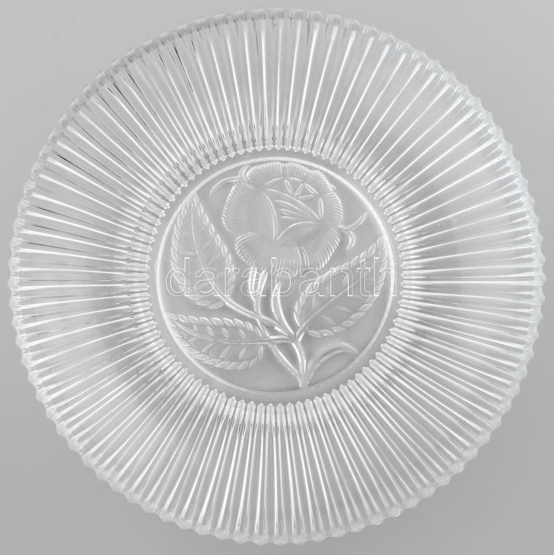 Beschreibung: Virágmintás üveg kínáló, formába préselt, hibátlan, jelzés nélkül, d: 28 cm