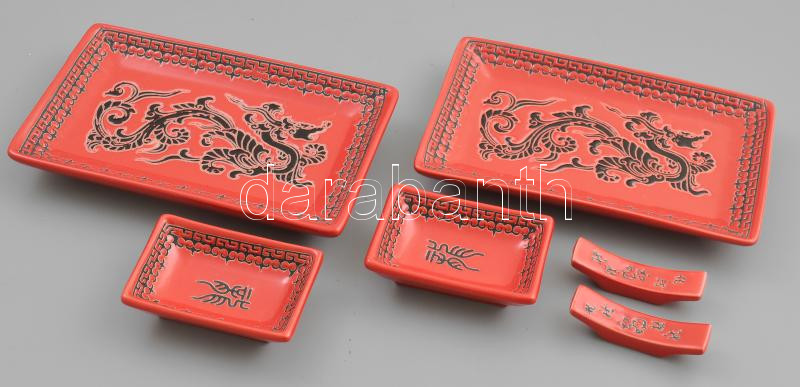 Beschreibung: 6 darabos sárkánymintás vörösmázas kínai szervírozó készlet. Jelzés nélkül, hibátlan, 20x13 cm